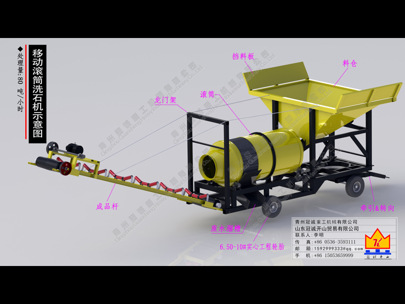 移动滚筒洗石机价格低,洗石效率高,是一款实用型移动式洗砂石设备,由青州冠诚重工机械有限公司生产研发,该机械小巧紧凑,结构简单,转场方便,维修故障低,使用寿命长。